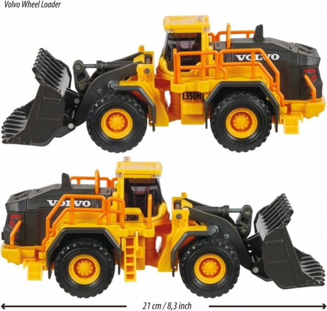 Lizenzierter VOLVO-Radlader ohne Motor mit Licht- und Soundfunktion. Die Kabine ist aus Metall gefertigt. Weiche Gummireifen meistern problemlos anspruchsvolles Gelände auf der Baustelle. Bewegliche Teile: zu öffnende Hecktür, Schaufel und Kabine, dank Steuerung kann das Fahrzeug leicht nach rechts und links lenken. Länge: 21 cm.