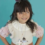 Die Halskette besteht aus der kunstvoll gearbeiteten Puppe namens Ruby und einer blauen Kette mit Perlen. Puppe Ruby ist aus Baumwolle und hat einen schönen Rock aus pfirsichfarbenem Tüll.