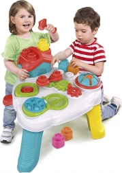 Alle Teile des Tisches bestehen aus ungiftigen und robusten Materialien, die für kleine Kinder sicher sind. Die Bauklötze sind weich und abwaschbar.