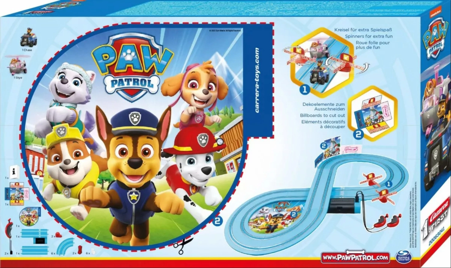 Entdecken Sie die ersten Rennerlebnisse mit der Carrera First PAW PATROL Autorennbahn. Dank übersichtlicher Controller, robuster Konstruktion und lizenzierter Autos von Chase und Skye genießen Kinder eine sichere und spannende Fahrt. Die 2,4 m lange Strecke lässt sich leicht aufbauen und bietet viel Spaß mit beweglichen Propellern.