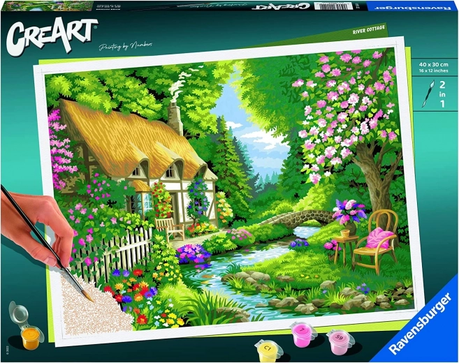 Das CreArt-Set bietet alles, was Sie brauchen, um auch ohne Erfahrung ein beeindruckendes Bild mit dem Motiv eines ruhigen Häuschens am Fluss zu malen. Dank der vorgedruckten farbigen Begrenzungen statt schwarzer Konturen wirken Kanten und Übergänge natürlicher und das fertige Bild erhält ein noch professionelleres Erscheinungsbild.