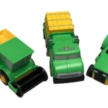Enthalten sind Modelle von Traktor, Mähdrescher und Lastwagen mit abnehmbaren Teilen. Der robuste Kunststoff hält dem täglichen Spiel stand, während realistische Details und Aufdrucke wie „Popular Farms“ thematische Geschichten vom Bauernhof unterstützen.