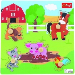 Dieses Mini-Holzpuzzle mit Bauernhof-Motiv ist ideal für Kinder ab 18 Monaten. Dank der Holzknöpfe liegen die Teile gut in der Hand und lassen sich leicht einsetzen. Die Grundplatte hat eingefräste Vertiefungen mit schwarz-weißen Konturen, die dem Kind das richtige Zuordnen der Formen erleichtern.