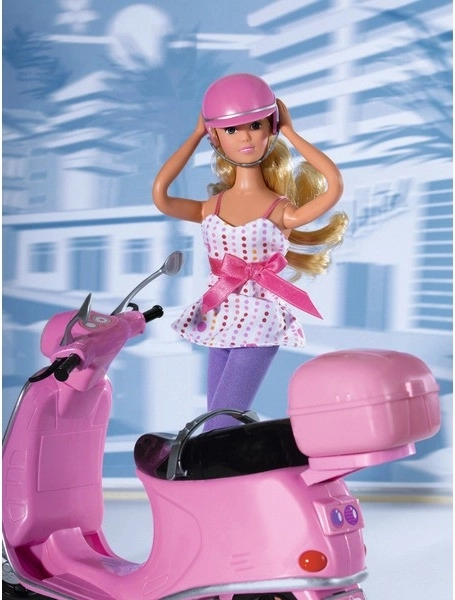 Puppe Steffi in Sommerkleidung, mit Helm und Sonnenbrille auf einem Roller mit Koffer.
