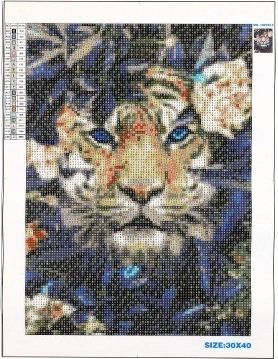 Erstellen Sie ein schönes Bild von einem Tiger in Blumen mit diamantener Brillanz. Das Bild ist ein kreatives Projekt mit klarer Anleitung und Farbcode zum einfachen Fertigstellen.