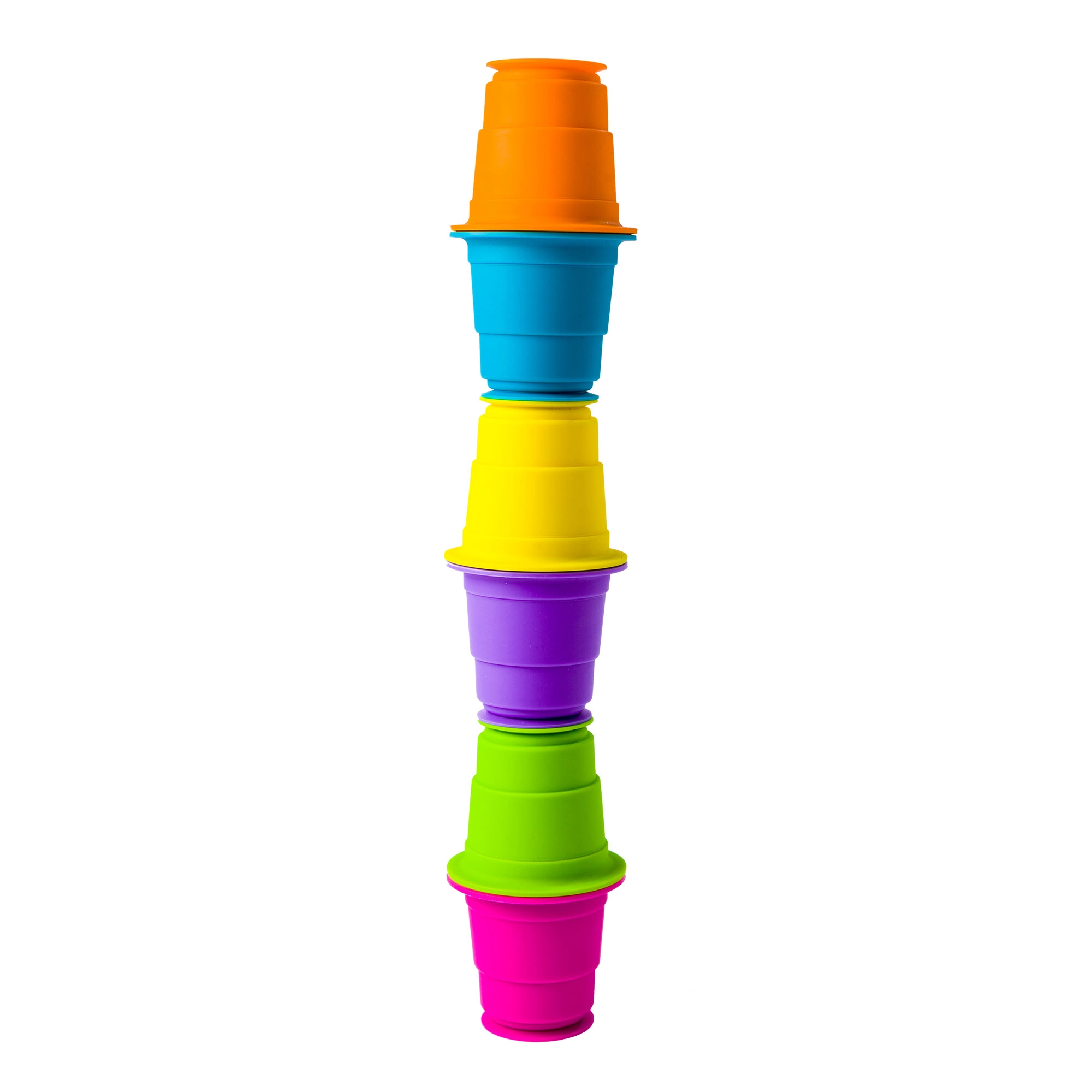 Das Spiel mit den Bechern fördert Fein- und Grobmotorik, Hand-Auge-Koordination sowie Farbunterscheidung. Kinder können die Becher zum Umfüllen von Wasser, Sortieren nach Größe und Farbe oder als erste Bausteine nutzen, die mit ihren Fähigkeiten mitwachsen.