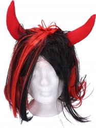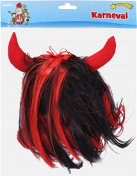 Stilvolle Teufelsperücke mit schwarzen Haaren und roten Strähnen, ergänzt durch textile rote Hörner. Ideal für Nikolaus, Maskenbälle und Mottopartys. Einfach aufzusetzen und sofortiger höllischer Effekt.