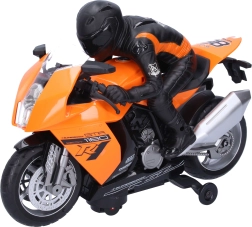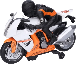 Genießen Sie eine actionreiche Fahrt mit dem stylischen Rennmotorrad mit einer Länge von 28 cm und Fahrerfigur. Es bietet Licht- und Soundeffekte, ein realistisches Design und zwei Farbvarianten – Orange und Weiß. Perfekt für kleine Rennfahrer und Motorradfans.