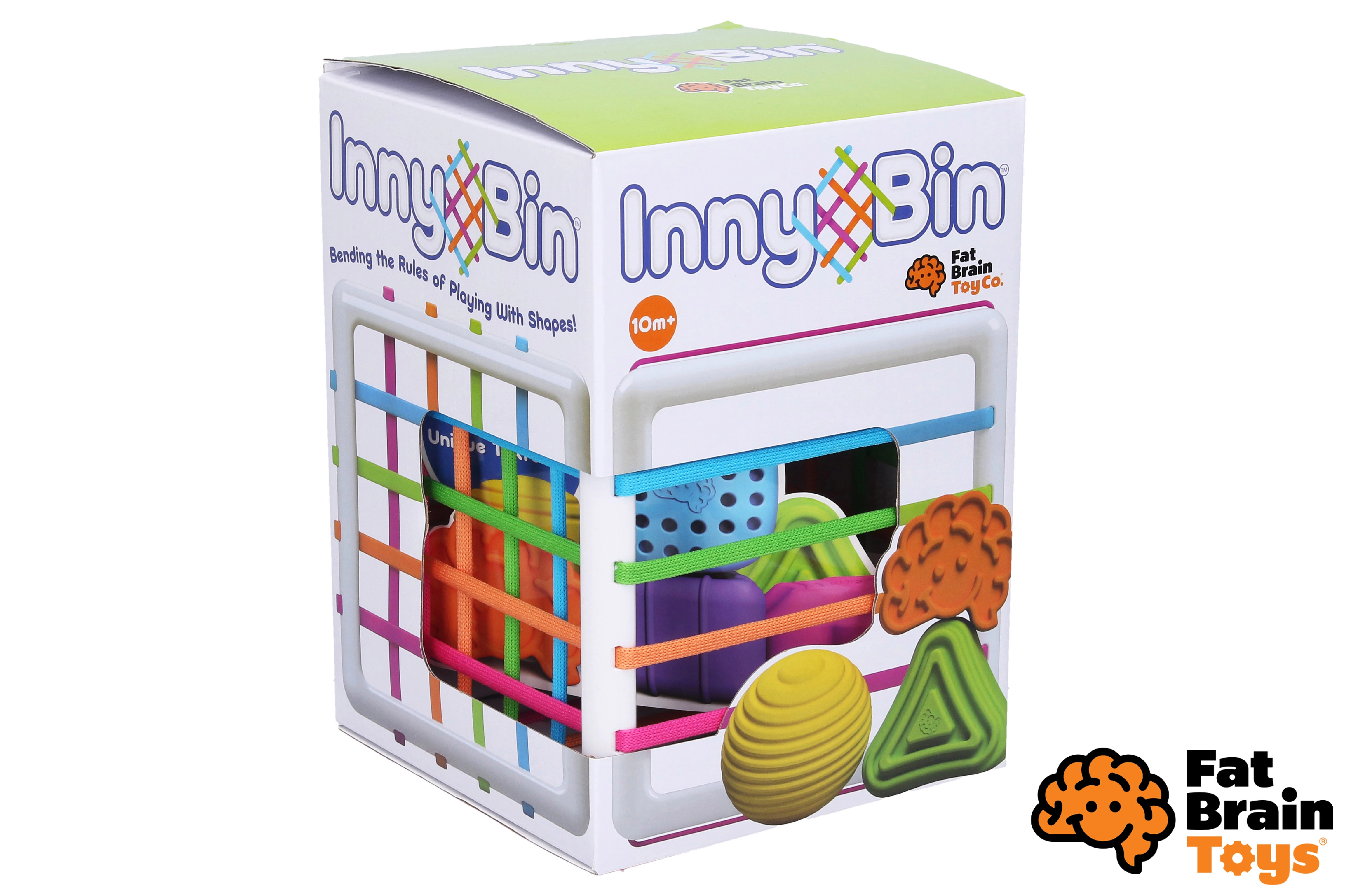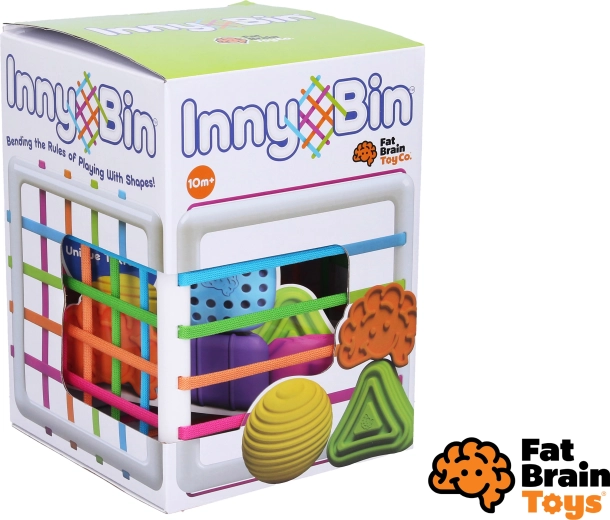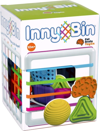 InnyBin von FAT BRAIN ist eine moderne Steckbox, die das klassische Sortieren von Formen in ein interaktives, sensorisches Spiel verwandelt. Kinder können die Formen drücken, greifen, hineinstecken und herausziehen – durch die farbigen, elastischen Schnüre, ohne eine Öffnung exakt treffen zu müssen. Das fördert die Fingerfertigkeit, Geduld und die natürliche Neugier.