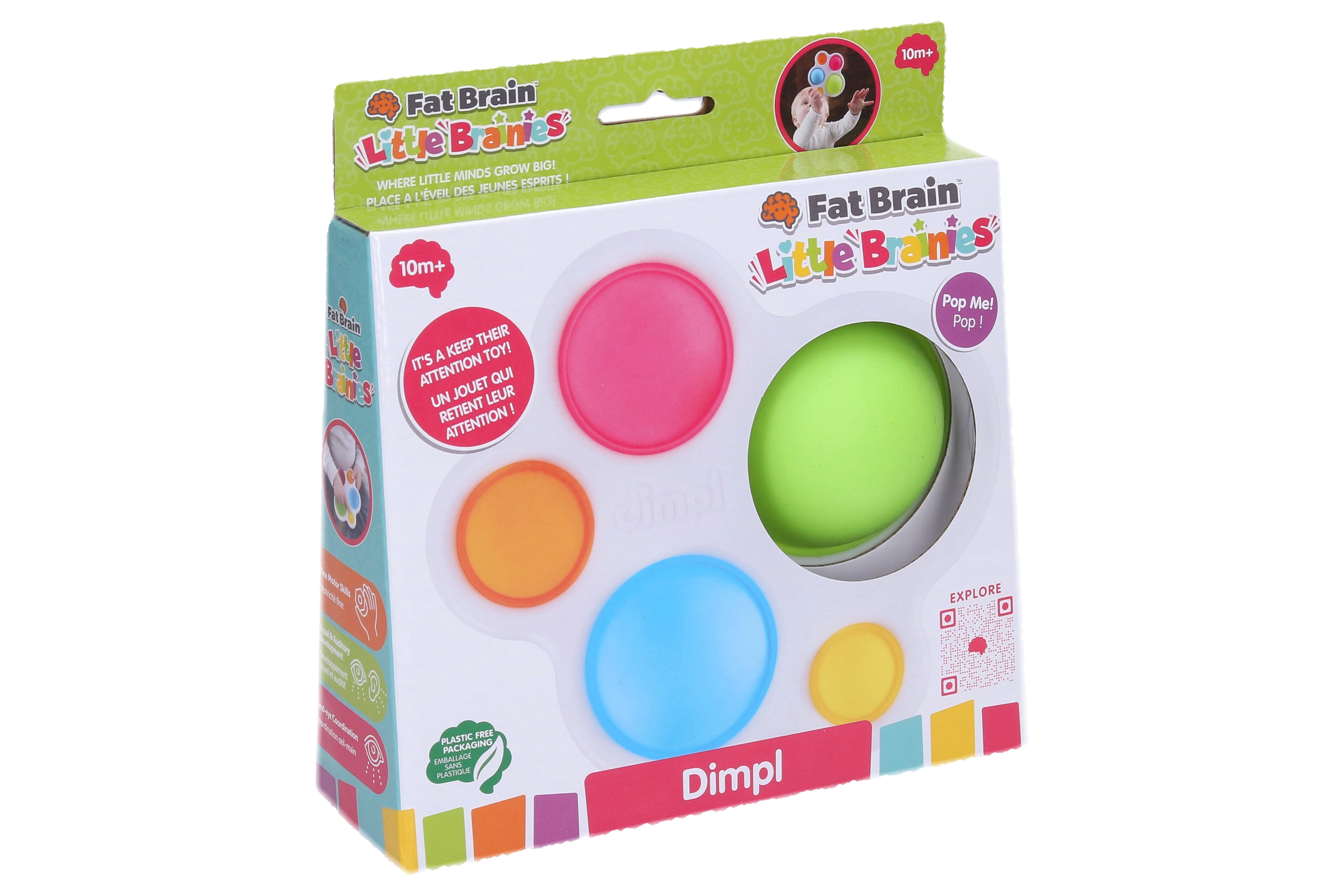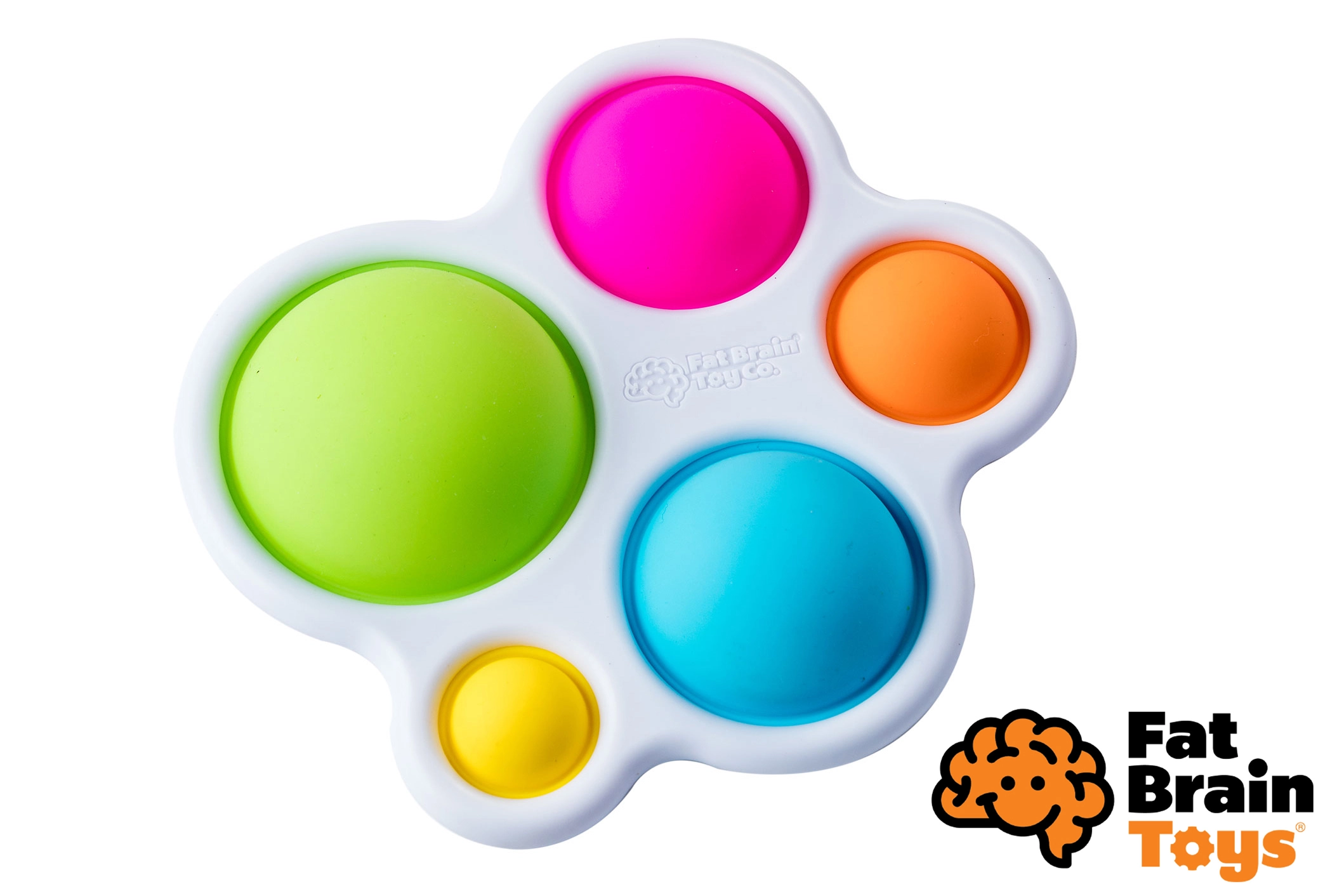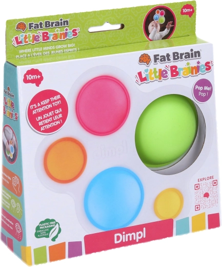 Dimpl von FAT BRAIN ist ein kompaktes sensorisches Spielzeug mit fünf farbigen Silikonblasen in einem robusten Kunststoffrahmen. Jede Blase lässt sich von beiden Seiten drücken und „ploppen“, was Kinder sofort fasziniert und zu wiederholtem Entdecken motiviert.
