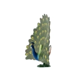 Die getreue Darstellung der „Pfauenaugen“ und der Kontrast des blauen Körpers mit den grünen Deckfedern verleihen der Figur ein eindrucksvolles, authentisches Erscheinungsbild.