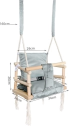 Diese Kinderschaukel ist für ein bequemes und sicheres Schaukeln zu Hause konzipiert. Die weiche Polsterung aus Cleanaboo ist angenehm im Griff, nimmt Flüssigkeiten nicht sofort auf und erleichtert die Pflege. Die stabile Holzkonstruktion mit sorgfältig abgerundeten Kanten und Sicherheitsgurten sorgt für Ruhe und Sicherheit für Sie und Ihr Kind.