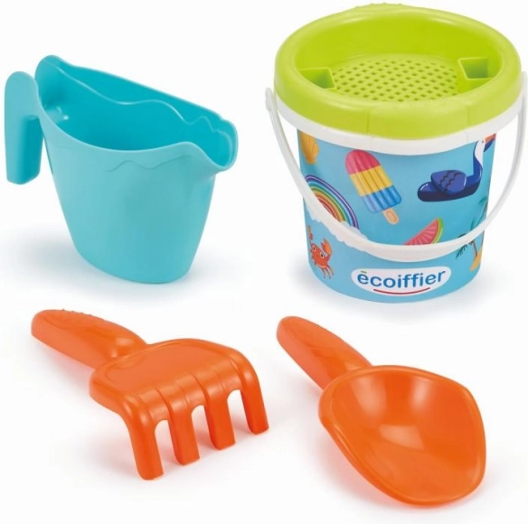 Kinder Eimer mit Sommermotiv und praktischem Zubehör für Sand: Gießkanne, Sieb, Harke und Schaufel.