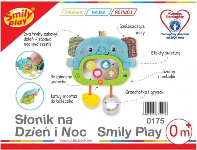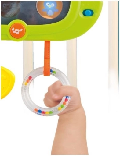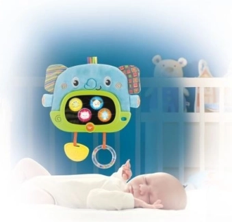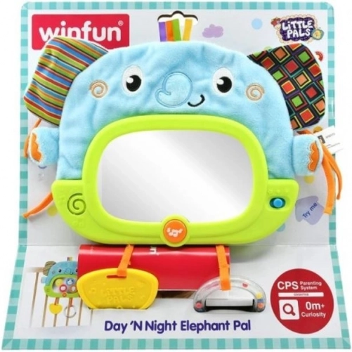 Der interaktive WINFUN-Elefant ist der ideale Begleiter fürs Bettchen und für die Spieldecke. Dank der flexiblen Befestigung lässt er sich leicht am Gitter des Bettchens anbringen oder mithilfe des klappbaren Ständers aufstellen. Kleine Händchen begeistert das sichere Spiegelchen mit sanfter Hinterleuchtung, in dem Tierbilder erscheinen, sowie die vielfältigen Materialstrukturen – weich, glatt und strukturiert.