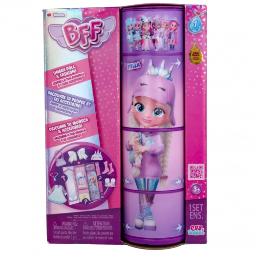 Lernen Sie die Teenie-Heldinnen aus der Welt der Cry Babies Magic Tears kennen – jetzt als BFF! Die Puppe Stella ist etwa 15 cm groß, hat seidig weiches Nylonhaar, funkelnde Augen und ein modernes Outfit, inspiriert von aktuellen Trends. Dank der Gelenke nimmt sie leicht verschiedene Posen ein – für kreatives Spiel und modische Magie.