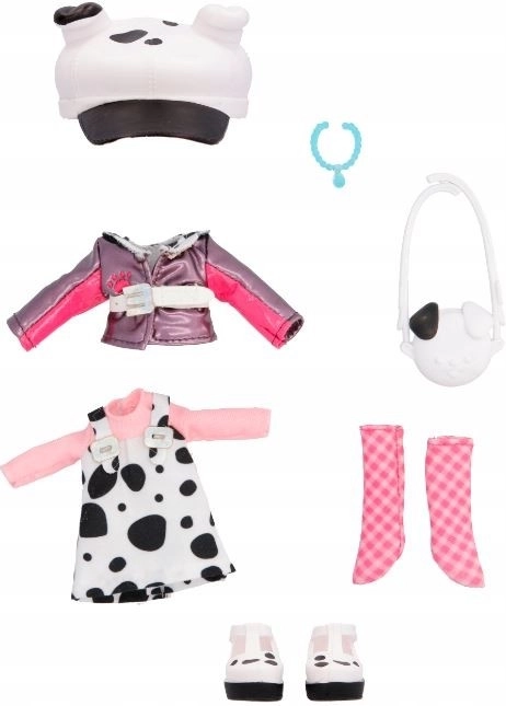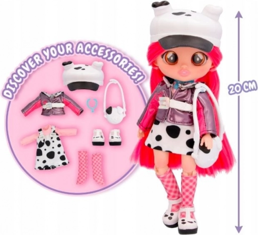 Dotty hat stylische, farbige Haare, kristallklare Augen und einen beweglichen Körper! Sie trägt ein modisches Outfit und ein besonderes gepunktetes Kleid mit Halskette, eine metallische Lederjacke, Plateauschuhe im Mary-Jane-Stil und karierte Socken! Ergänze sie mit einer Umhängetasche, einer niedlichen Mütze mit Hundsohren und der passenden BFF-Halskette!