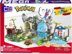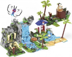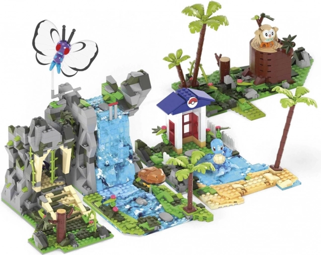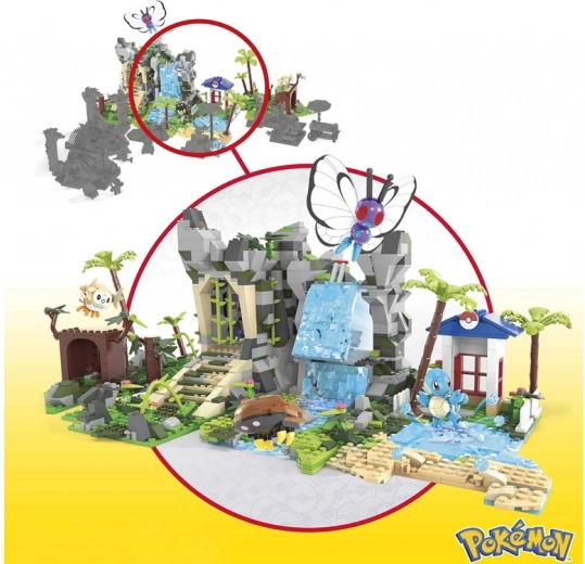 Die vier modularen Bereiche können nach Belieben umgebaut und verbunden werden: Höhle im Regenwald, Berg mit Wasserfall, Eingang zu antiken Ruinen und See mit Strand und Palmen. Außerdem enthalten sind vier ikonische, baubare Pokémon-Figuren: Butterfree, Schiggy, Kabuto und Bauz.