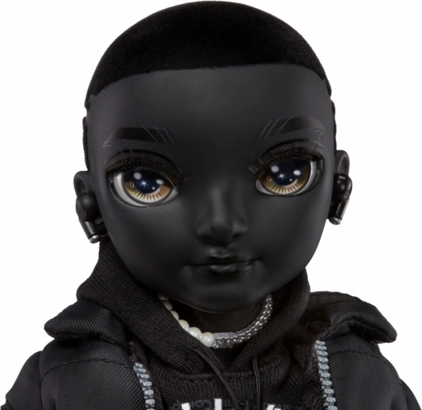 Die Puppe ist in ein stilvolles schwarzes Outfit mit modernem und urbanem Look gekleidet, einschließlich eines langen schwarzen Mantels und Accessoires.