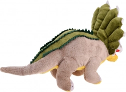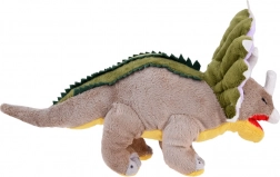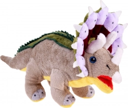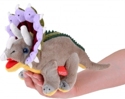 Dieser Plüsch-Dinosaurier stellt eine getreue Replik eines Triceratops mit charakteristischen Hörnern und ausdrucksstarken blauen Augen dar.