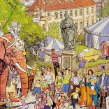 Kreatives Puzzle in einer außergewöhnlichen dreieckigen Schachtel, das Groß und Klein großartigen Spaß bereitet. Das Motiv des deutschen Künstlerduos Doro Göbel und Peter Knorr zeigt eine lebendige und humorvolle Umzugsszene.