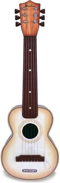 Klassische Bontempi-Gitarre mit 6 Stahlsaiten, Länge 55 cm. Beim Spielen erzeugt sie realistische Klänge. Sie ist eine hervorragende Wahl für Kinder, die Interesse an Musik zeigen und ihre ersten Fähigkeiten entwickeln möchten.