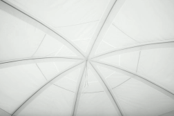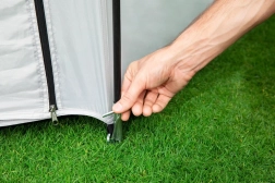 Der Pavillon wird in etwa 15 Minuten aufgebaut. Spannseile und Heringe erhöhen die Stabilität und verankern die Konstruktion sicher im Boden.