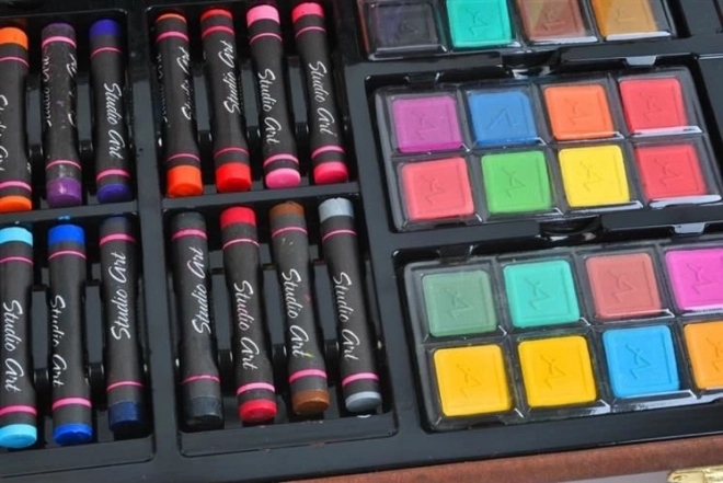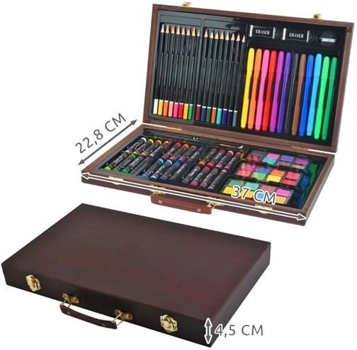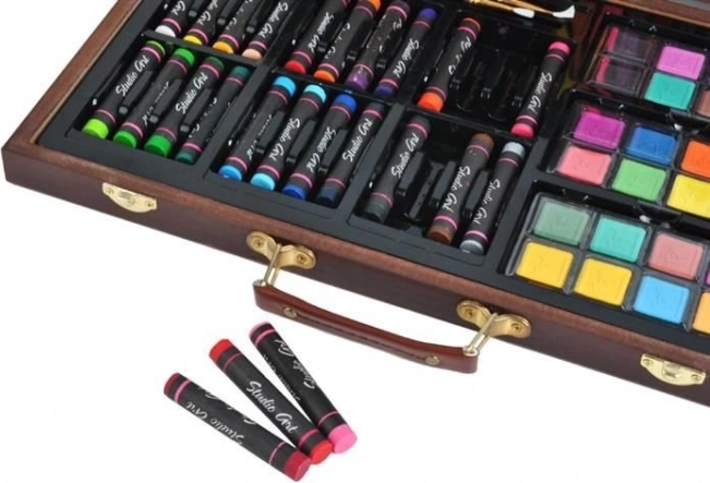 Dieses vielseitige Kreativ-Set bietet alles, was Sie zur Entfaltung Ihrer Kreativität brauchen – vom Skizzieren bis zur Aquarellmalerei. Alles ist in einem robusten Holzkoffer mit sicheren Metallverschlüssen und einem bequemen Ledergriff für einfaches Tragen untergebracht. Dank separater Fächer haben Sie jedes Werkzeug sofort griffbereit und perfekt organisiert.
