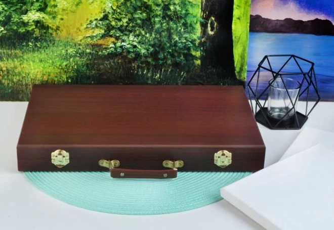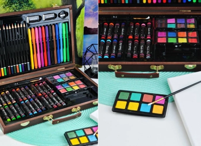 Alle Künstlermaterialien sind ordentlich in einem aufklappbaren Holzkoffer mit Fächern angeordnet, sodass Sie stets schnellen und einfachen Zugriff auf alles haben, was Sie benötigen.