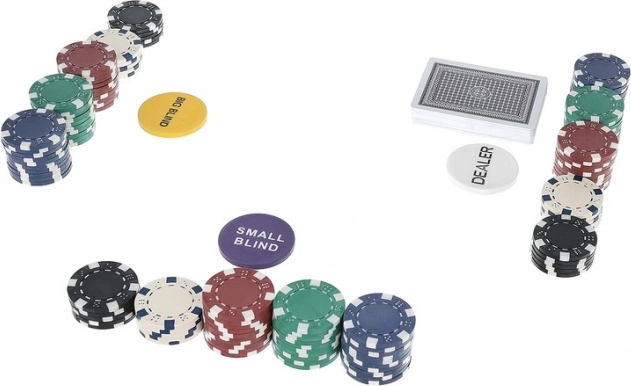 Im Lieferumfang enthalten sind außerdem Funktionschips DEALER, SMALL BLIND und BIG BLIND für eine übersichtliche Organisation des Spiels, 2× 54 Karten für eine flüssige Deck-Rotation sowie 5 Würfel für zusätzlichen Spielspaß am Tisch. Das Set ist ideal für Heimspielräume, Partys und freundschaftliche Duelle.