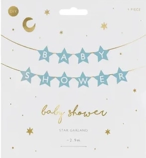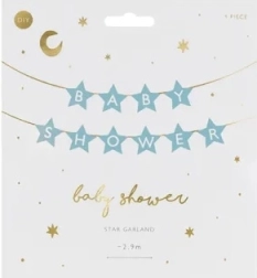Stilvoller Banner für die Babyparty mit Sternchenmotiv und dem Schriftzug „Baby Shower“ in zartem Hellblau. Ideal zur Dekoration für die werdende Mama, lässt sich leicht aufhängen und schafft eine sofortige festliche Atmosphäre. Schnurlänge ca. 3 m, Bannermaß 290 × 16,5 cm.