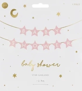 Verleihen Sie Ihrer Babyparty-Deko Charme mit einem Papierbanner mit Sternchen und dem Schriftzug Baby Shower. Die hellrosa Ausführung ist ideal für zarte, elegante und fotogene Dekorationen.