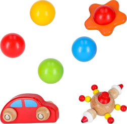 Enthalten sind bunte Kugeln, ein rotes Holzauto und Figuren-Zubehör für variable Spiele und Rennen.