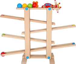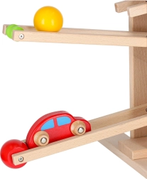 Zickzack-Rampen aus glattem Holz sorgen für einen fließenden Lauf von Kugeln und Autos und fördern Koordination und Geduld beim Spielen.