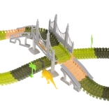 Das Set enthält: 160 Streckenteile, ein Auto, 2 Dinosaurier, 4 Palmen, eine Brücke und ein Tor. Das Auto wird von 1 AA 1,5V Batterie betrieben, die nicht im Lieferumfang enthalten ist. Alle Streckenteile lassen sich leicht zusammenfügen und sind sehr flexibel für verschiedene Formen und Variationen.