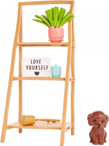 Enthalten sind eine freistehende Badewanne mit Ablagetablett, ein Regal in Holzoptik sowie viel Zubehör: große und kleine Bürste, Fläschchen mit Balsam, Seife, Kerze, Pflanze, dekorativer Schriftzug und ein niedlicher Welpe. Regal und Tablett haben praktische Halterungen, damit das Zubehör während des Spiels an seinem Platz bleibt.