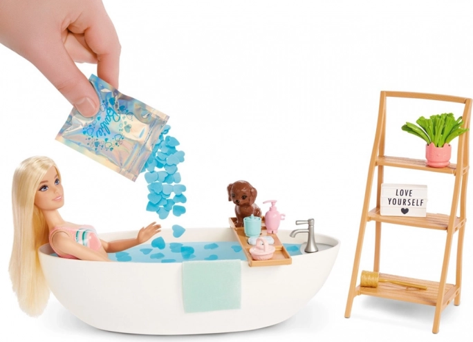 - Barbie-Puppe (blond), Badewanne mit Tablett, Regal, 2 Beutel Konfetti (rosa und blau), große Bürste, kleine Bürste, Balsamfläschchen, Seife, Kerze, Pflanze, dekorativer Schriftzug, Welpe