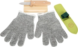 Ein Paar Handschuhe in Größe XS schützt Kinderhände vor Schnittverletzungen und verbessert den Griff des Werkzeugs beim Schnitzen.