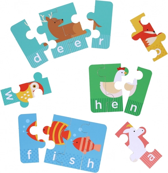Jedes Puzzle verknüpft ein niedliches Tierbild mit einem englischen Wort aus 3–4 Buchstaben. Spezielle Teileformen geben Hinweise auf die richtige Lösung und unterstützen die ersten Buchstabierübungen.