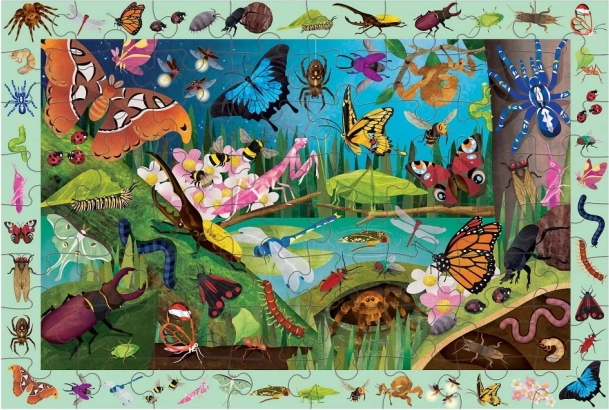 Tauchen Sie ein in die farbenfrohe Welt der Insekten – von der Atlasspinner-Motte über Glühwürmchen bis zu Marienkäfern. Dieses 64-teilige Puzzle verbindet Spaß und Lernen: Zuerst wird ein detailreiches Bild zusammengesetzt, anschließend suchen Kinder im Rahmen rund um die Szene über 40 verschiedene Arten. Dank der matten Oberfläche und der stabilen Rückseite liegen die Teile gut in der Hand und passen präzise zusammen.