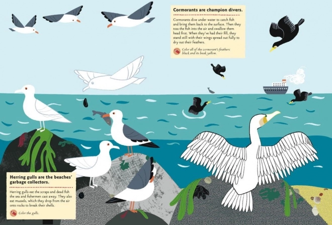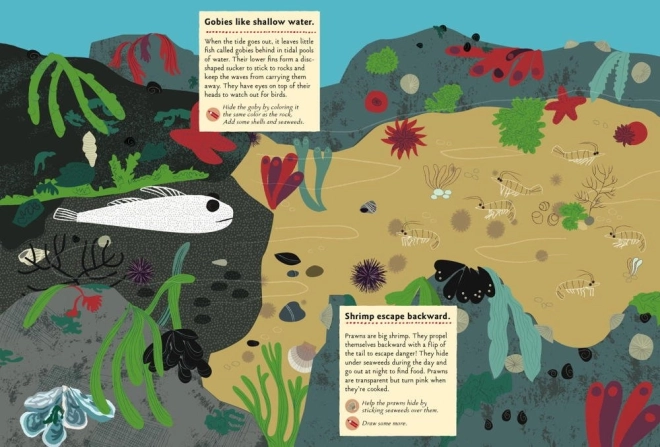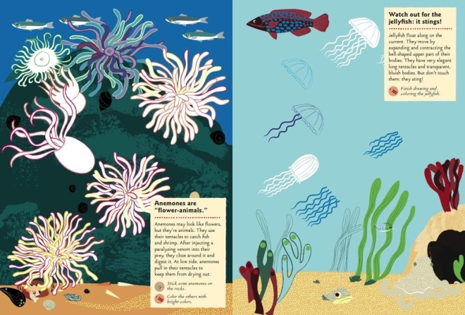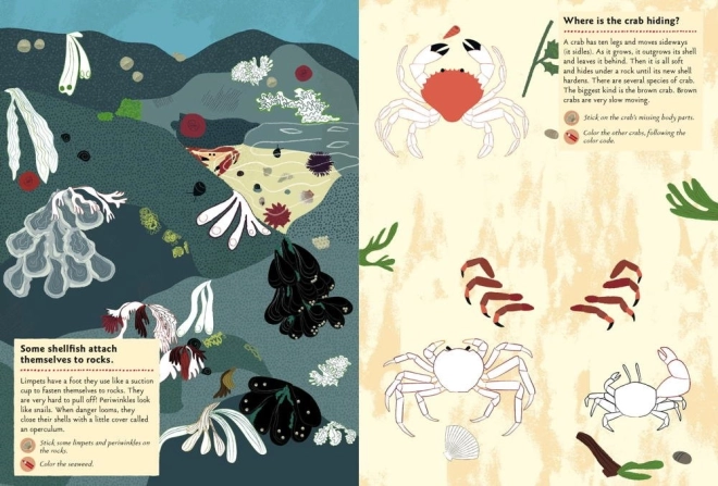 • 24 Aktivitäten einschließlich Ausmalen von Quallen und Seeanemonen, Ergänzen des Krabbenkörpers oder Zeichnen von Muscheln, Schilf und Seesternen