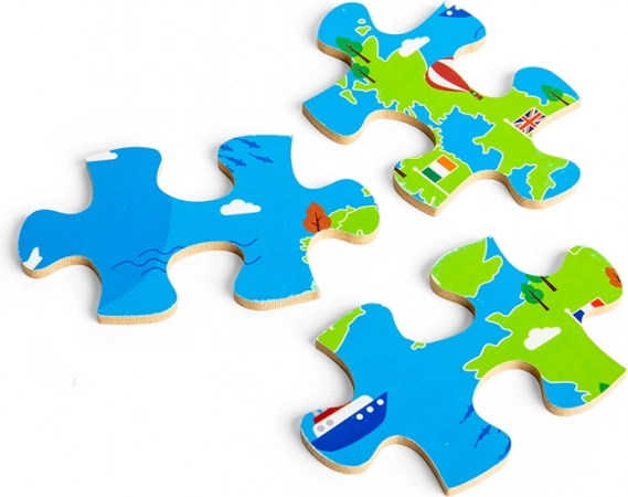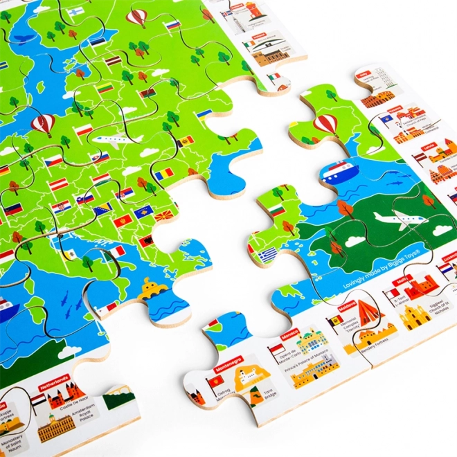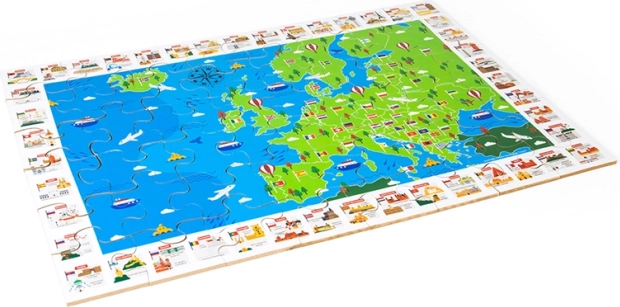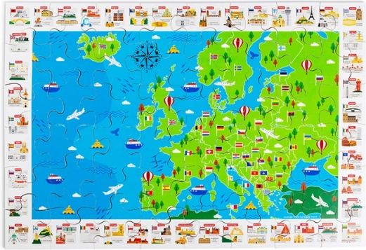 Die farbenfrohe Europakarte mit Flaggen und ikonischen Sehenswürdigkeiten motiviert Kinder, die Länder und ihre Lage zu entdecken. Das Puzzeln fördert Logik, Orientierung und den Wortschatz.