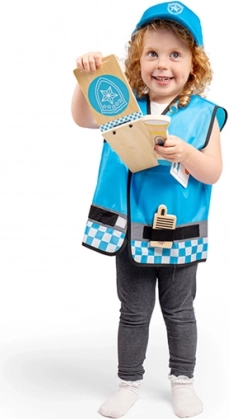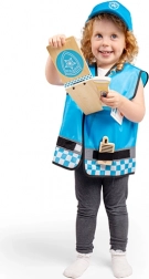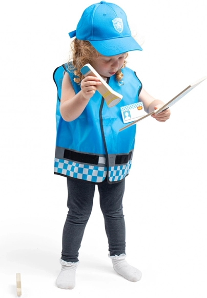 Die blaue Weste mit reflektierenden Elementen und die Mütze mit Emblem sorgen für einen authentischen Polizeilook und fördern soziale sowie kommunikative Fähigkeiten.