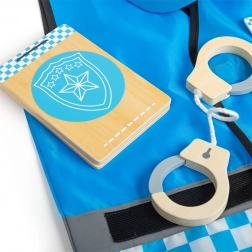Enthalten sind ein Funkgerät aus Holz, eine Taschenlampe, Handschellen, ein Ausweisabzeichen und eine Dokumentenbörse – sichere und robuste Accessoires für kleine Hände.