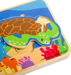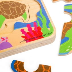 Dieses wunderschön illustrierte Holzpuzzle zeigt Kindern anschaulich, wie eine Schildkröte wächst – vom Ei über das Jungtier bis zur erwachsenen Schildkröte. Die einzelnen Teile werden der Größe nach eingesetzt, sodass Kinder Schritt für Schritt die nächste Entwicklungsphase entdecken.
