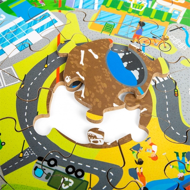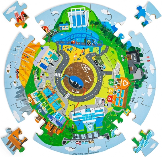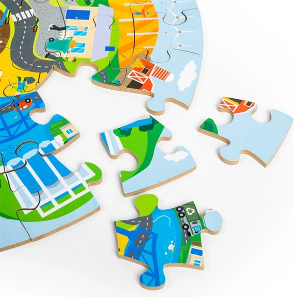 Das hochwertige Holzpuzzle in runder Form ist eine hervorragende Wahl für erste Lernpuzzles. Dank klarer Farben und ansprechender Szenen aus Stadt und Natur finden sich Kinder leicht im Thema Abfalltrennung und Umweltschutz zurecht.