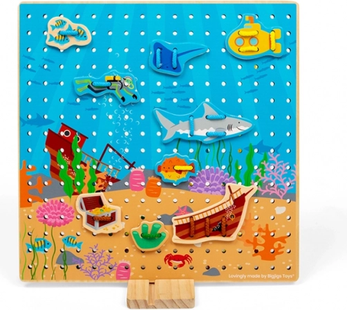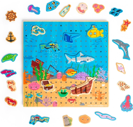 Das Set enthält 30 Teile und 6 farbige Schnüre, mit denen sich unzählige Szenen gestalten lassen – von Fischen und Tauchern bis hin zu einem U-Boot und einem versunkenen Schiff. Die Materialien sind nachhaltig gewonnen und das Spielzeug erfüllt die aktuellen europäischen Sicherheitsnormen.