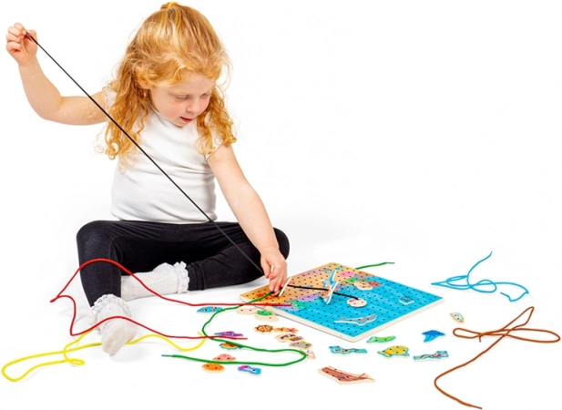 Das Durchfädeln der Teile durch die Löcher trainiert spielerisch Griff, Bewegungsgenauigkeit und Hand-Auge-Koordination – ideale Vorbereitung auf das Schreiben.