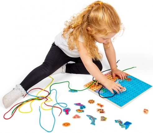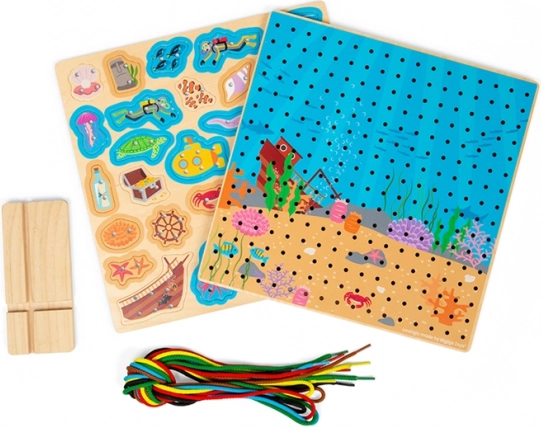 Das Fädelbrett mit Unterwassermotiv ist ein ideales Lernspielzeug für Kinder ab 3 Jahren. Die perforierte Holzplatte, bunte Schnürsenkel und ein Set mit Meeresmotiven lassen Kinder Fingerfertigkeit, Fantasie und Konzentration üben. Das Spiel ist intuitiv und dank der stabilen Konstruktion aus hochwertigem Holz bestens für den täglichen Einsatz geeignet.