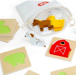 Dieses Reisespiel zum Thema Bauernhof begeistert Kinder beim Entdecken. Sie stecken die Hand in den Stoffbeutel und suchen tastend das Teil, das in die passende Holzunterlage passt. Ein spielerisches Training für Konzentration, Hand-Auge-Koordination und Wortschatz beim Benennen der Tiere und Gegenstände vom Bauernhof.
