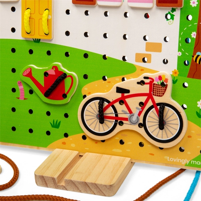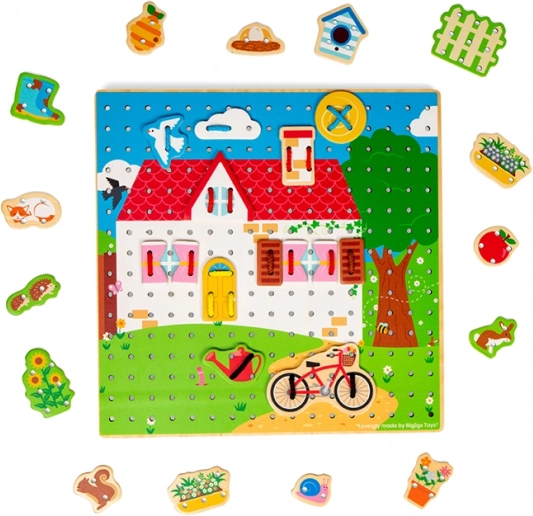 Die Fädelplatte Haus BIGJIGS TOYS ist ein ideales Aktivspielzeug für Kinder ab 3 Jahren. Dank der perforierten Holzplatte und der bunten Schnüre können Kinder aus den einzelnen Teilen immer neue Szenen gestalten – von kleinen Fenstern und Blumen bis hin zu einem Rad oder Wolken. So trainieren sie ganz natürlich Feinmotorik, Augen-Hand-Koordination und Konzentration.